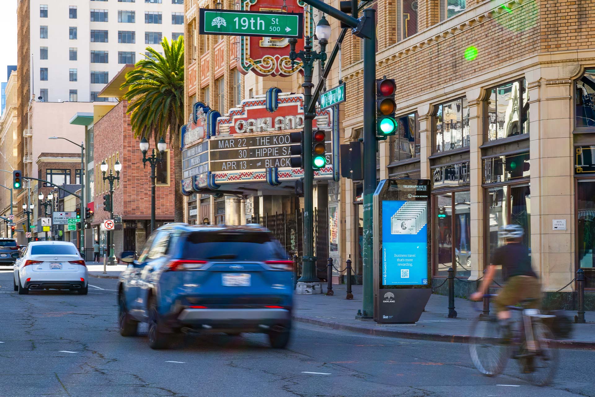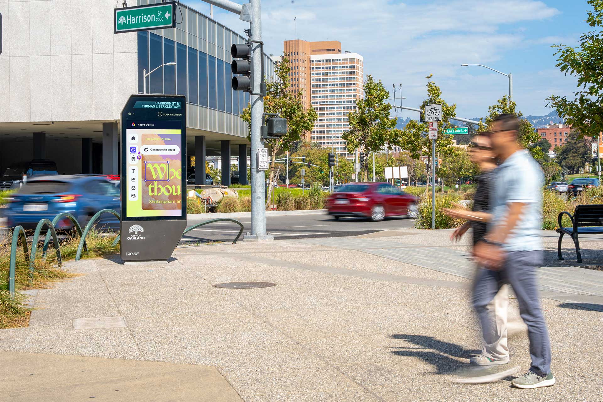 Extending coverage to East Bay, IKE interactive digital kiosks offer premier street-level advertising in the dense urban core of Downtown Oakland by popular destinations buzzing with activity—City Center, McMullen, Paramount Theatre, and Fox Theater—and in the vibrant commercial corridors of Berkeley, bustling with a diverse mix of students, young professionals, creatives, philosophers, and foodies streaming into casual restaurants, artisanal coffee houses, eclectic shops, and nightlife next to the University of California, Berkeley.