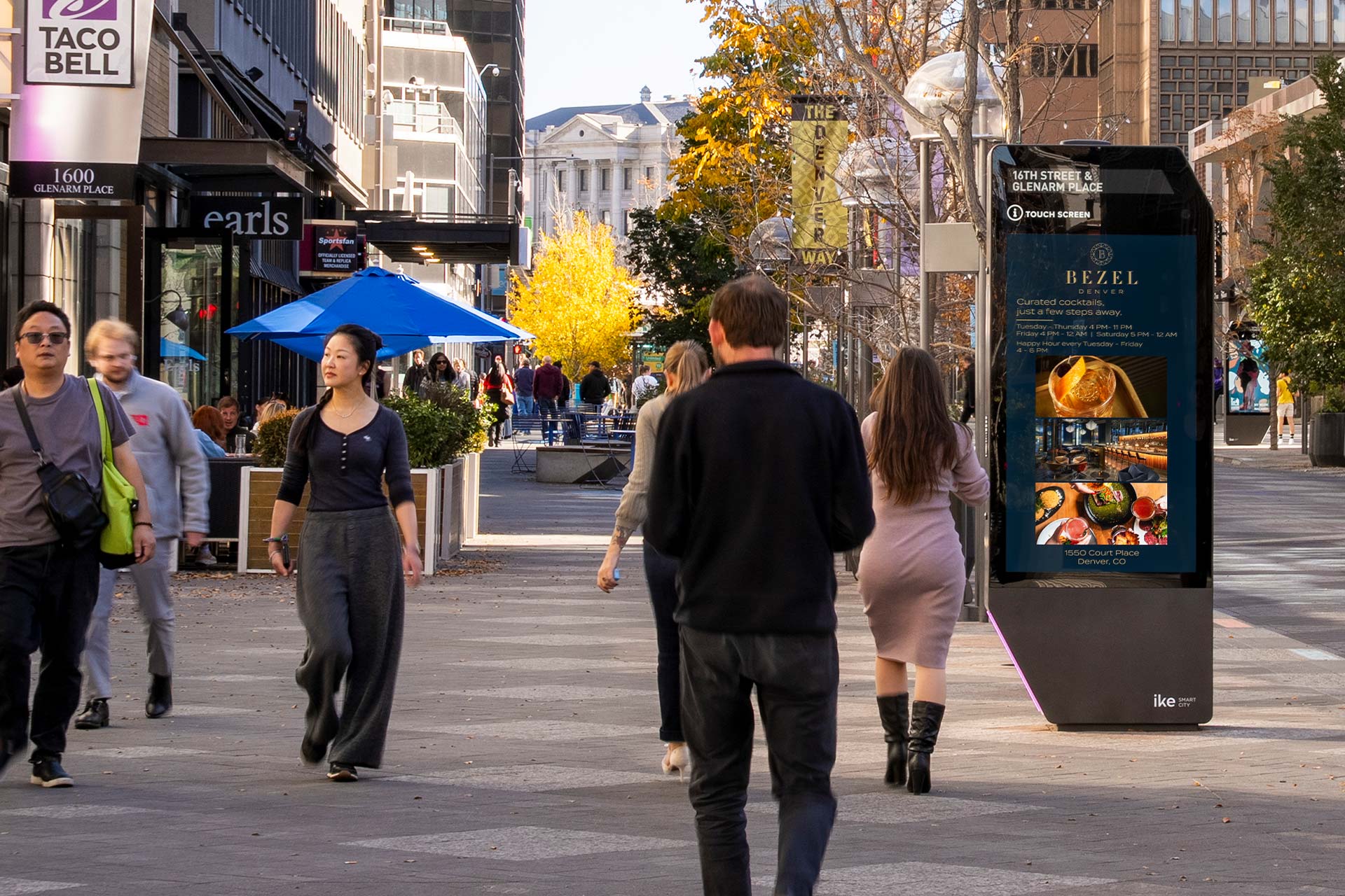 We offer coverage throughout Denver’s most dynamic Downtown district with architecturally integrated wallscapes, large-format digital screens, and a network of unique interactive digital kiosks (IKE) that provide valuable public services and community resources. Our assets reach highly engaged audiences in the Central Business District, Theatre District, and 16th Street – areas bustling with retail, entertainment, dining, and business establishments.