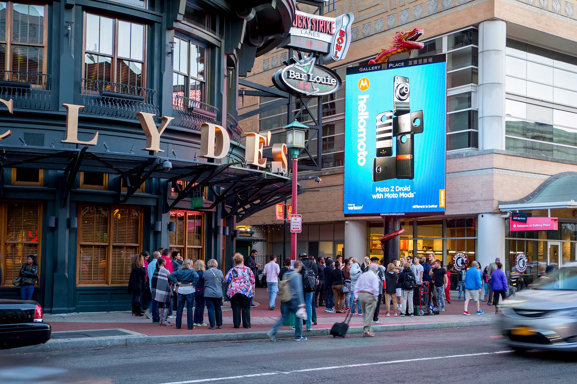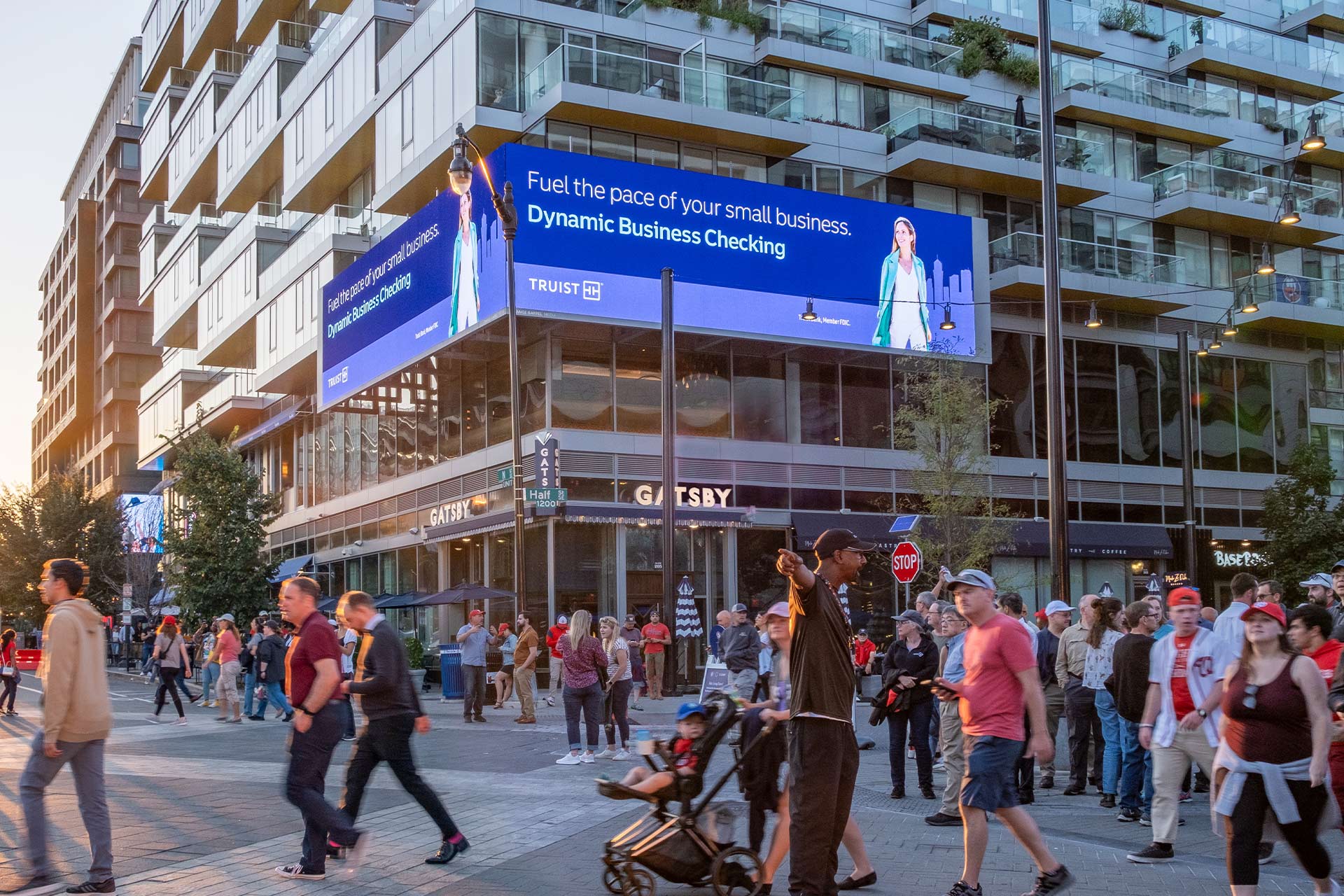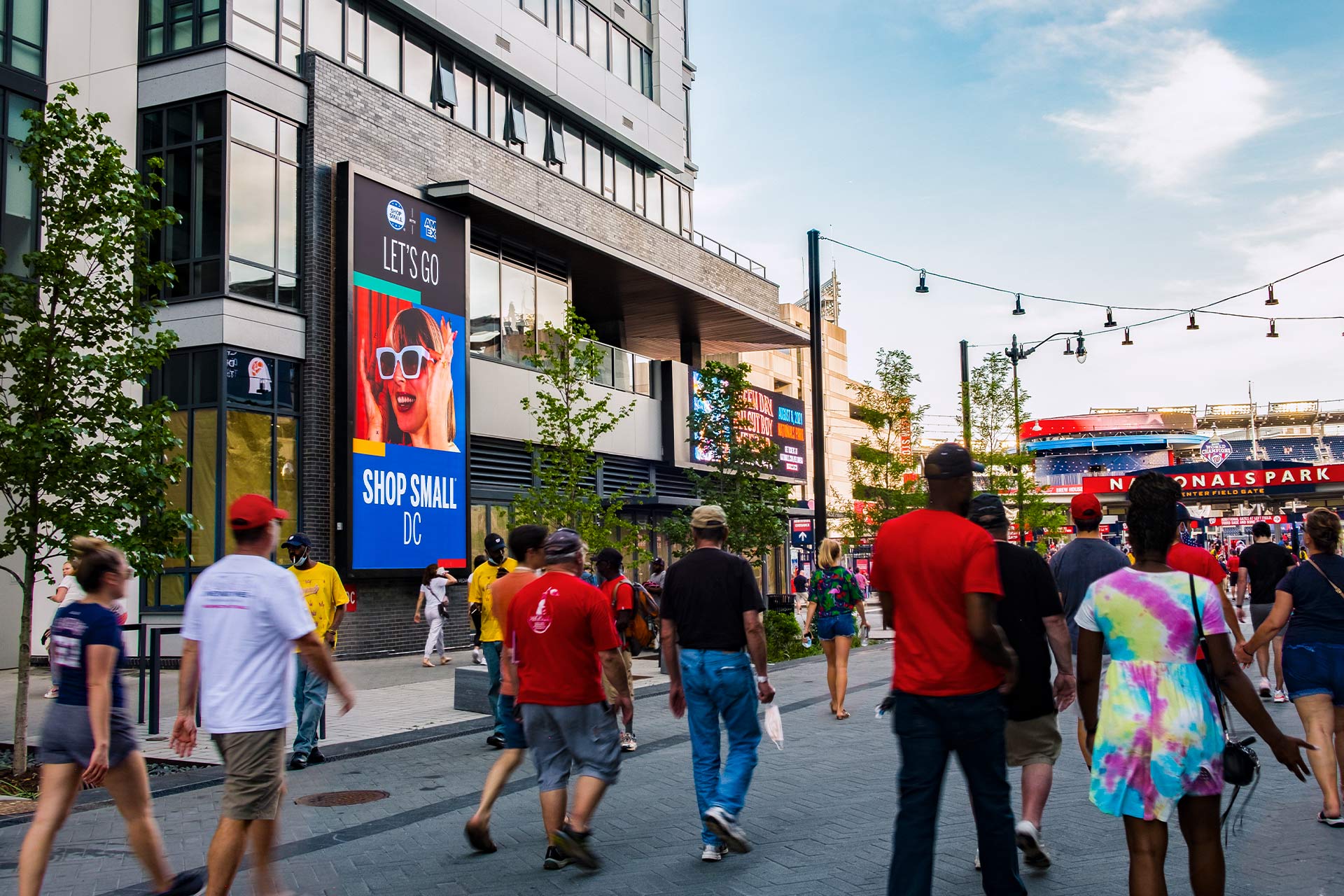 Our full-motion digital spectaculars, static spectaculars, and dominations offer creative opportunities in high-traffic areas of the nation’s capital. Gallery Place, a vibrant 24-hour neighborhood with the highest concentration of restaurants and nightlife venues in the District, is steps from Capital One Arena, CityCenterDC, and Metro Station. In the revitalized Navy Yard/Capitol Riverfront District, a hip and bustling waterfront neighborhood, our digital signs sit directly across from the main entrance to Nationals Park, home of MLB’s Washington Nationals, and steps from world-class dining, trendy bars, luxury apartments, office space, and Metro Station, all centrally located south of Capitol Hill.